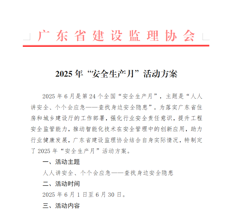 為確保“安全生產月”各項活動順利開展,協(xié)會領導班子高度重視,提前謀劃,成立了專項工作小組,制定《廣東省建設監(jiān)理協(xié)會2025年“安全生產月”活動方案》,明確活動目標、時間安排、重點任務及責任分工,并及時傳達省住房城鄉(xiāng)建設廳的文件精神,確保政策落地見效。各會員單位積極響應,圍繞“安全生產月”主題,結合本單位實際,組織開展了一系列富有成效的宣傳教育和隱患排查整治活動,形成了上下聯(lián)動、齊抓共管的良好局面。